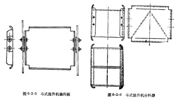 为了限制牵引构件在提升高度较大时产生过大的横向摆动,以及料斗在输送和卸料中返流回的物料不致掉落在张紧滚筒上,在中间机売内还应装置专门作导向用的偏向板和使物料分流至机壳两侧的分料器。它们的结构分别如图62-5和图6-2-6所示。由于分料器的外形和结构与偏向板类似,所以,分料器也同时具有限制牵引构件横向摆动的作用。斗式提升机高度和与其对应的偏向板的数量,可见斗式提升机成套表。显然,为了防止牵引构件左右两分支的摆动,偏向板都是成对使用的,如图6-2-1所示。