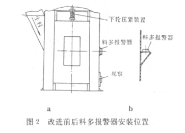 GTD315提升机的料多报警器原来的安装位置如图2中a所示。在带负荷为80%的情况下运转,曾几次因“料多”报警而导致系统停车。事后检查,提升机底部没有集料现象。经观察分析,我们认为该提升机入料溜子高,生料入提升机斗后,形成少量飞溅冲击。另外,斗内没卸完和残余物料下落时也会出现碰撞飞戏。料多报警器为薄膜式,反应灵敏,碰撞或飞溅的物料会造成误报警。针对这一问题,我们对料多报警器的安装位置做了改进,如图2中b所示,从1992年6月改进后,报警器没有再发生误报警现象。